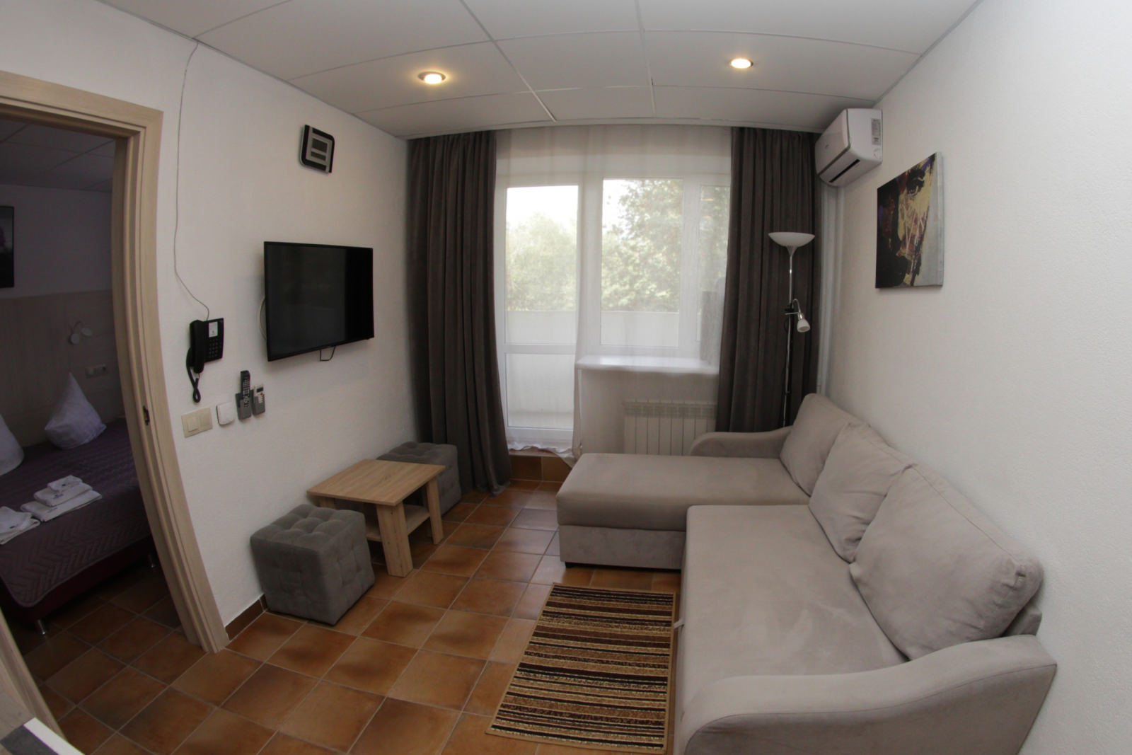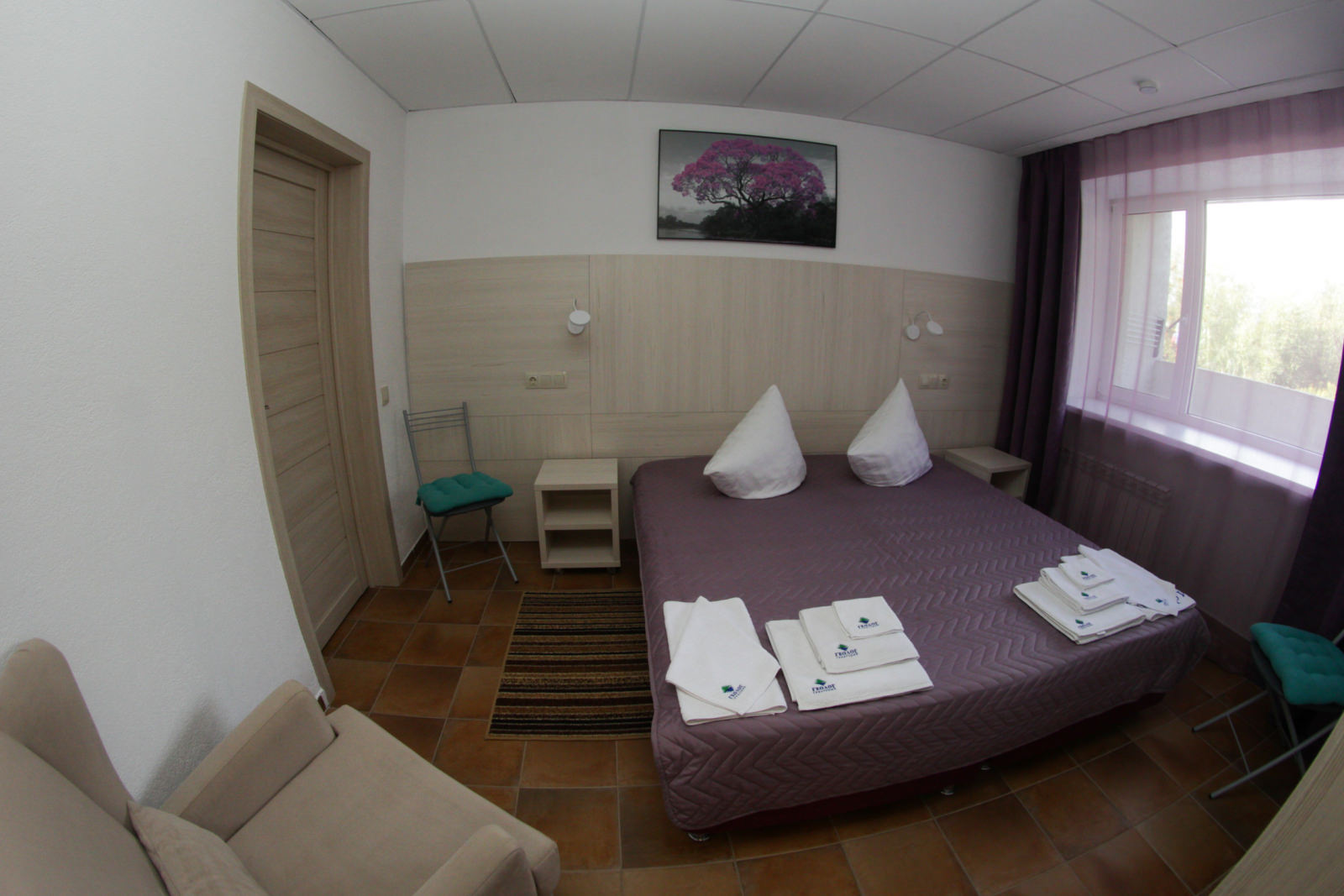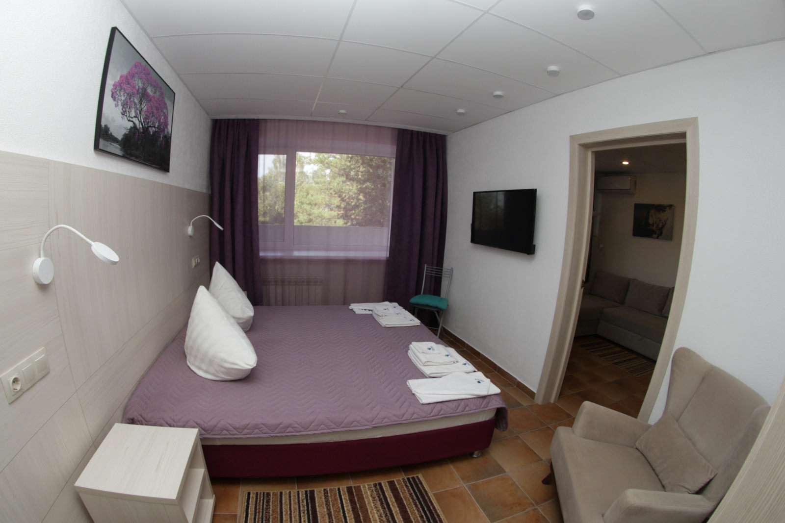 Площадь номера - 36 кв.м. 2 осн. места. 2 доп. места. Мебель: вешалка, гардеробная, диван раскладной, кровать двуспальная, прикроватные тумбочки, стулья. Мини-кухня. Оборудование: кондиционер, мини-холодильник, набор посуды, телевизор, утюг, электрочайник. Санузел: биде, с душем, туалетные принадлежности, халат ((махровый и вафельный)). Сервис: смена полотенец, смена постельного белья, уборка номера.