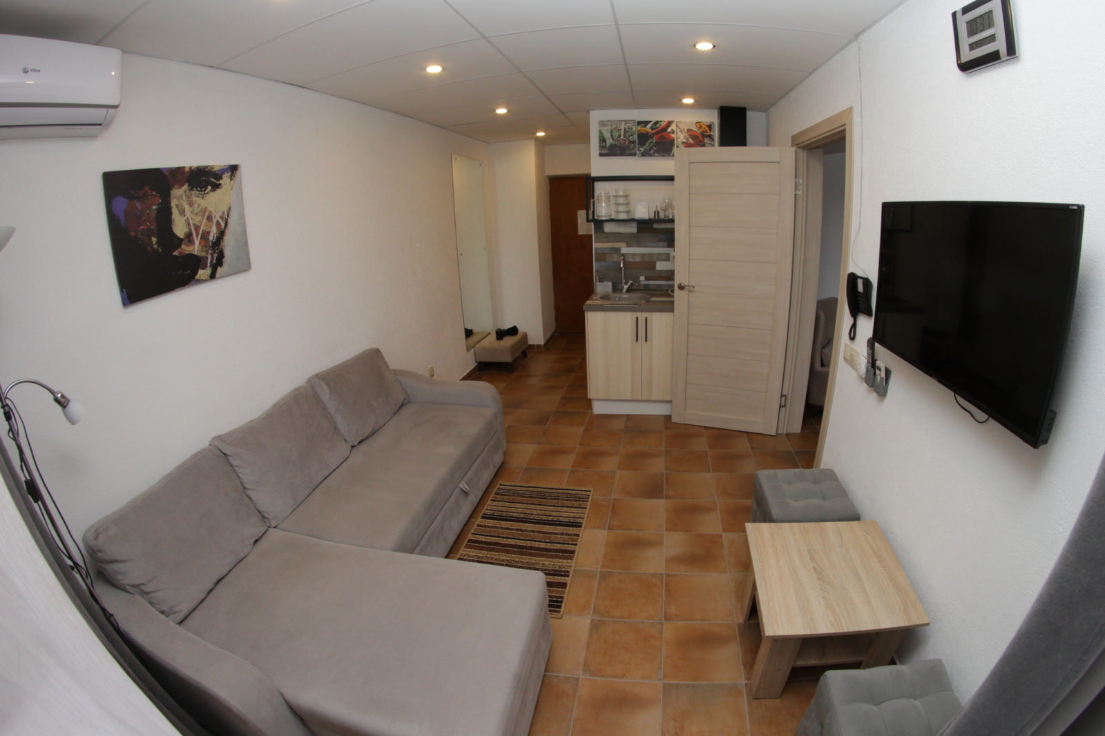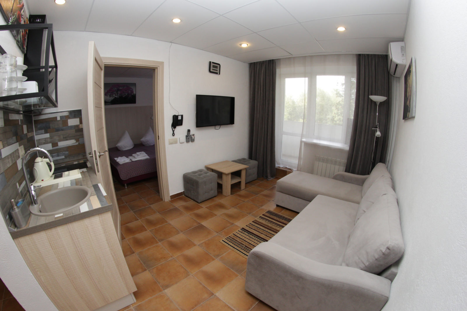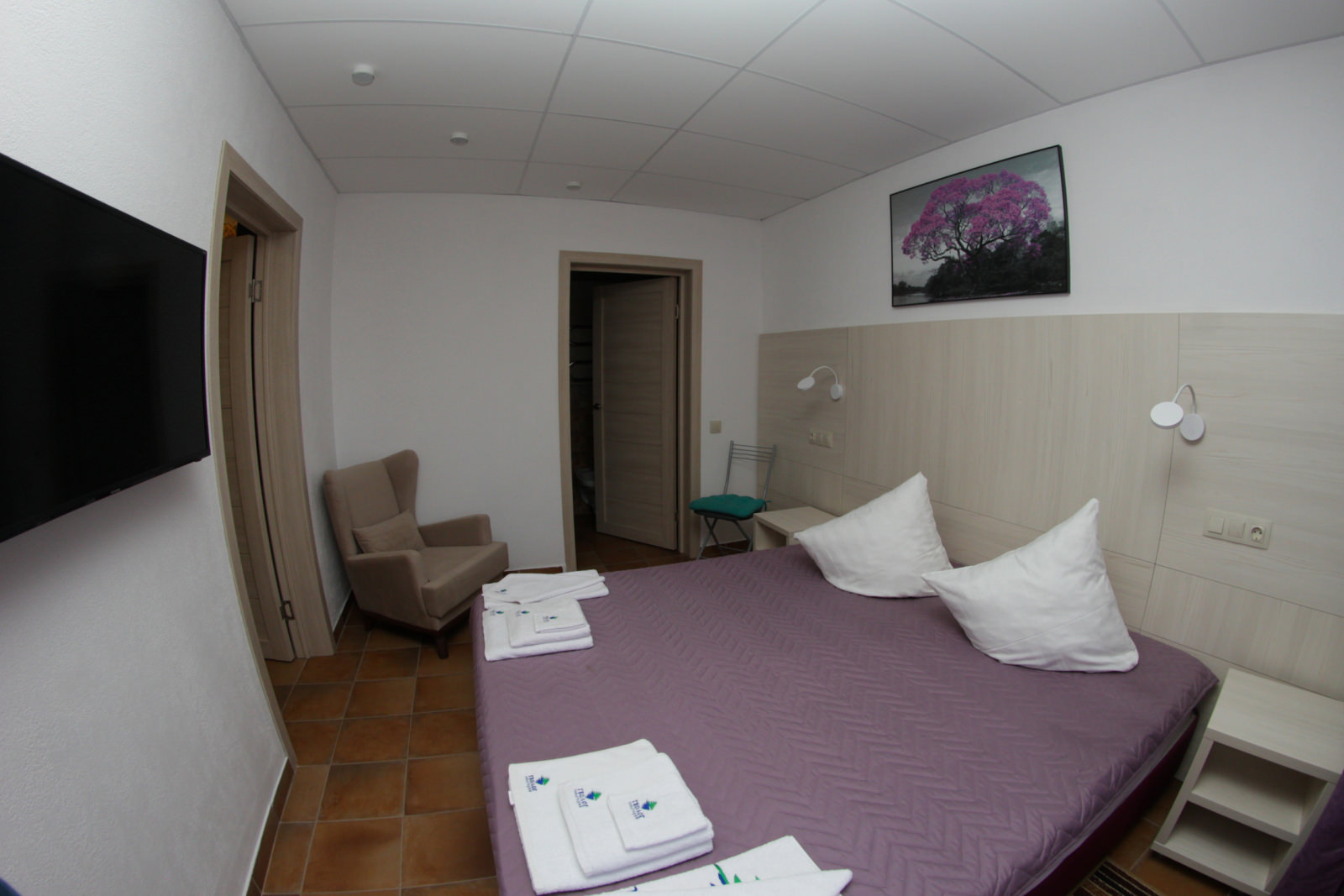 Площадь номера - 36 кв.м. 2 осн. места. 2 доп. места. Мебель: вешалка, гардеробная, диван раскладной, кровать двуспальная, прикроватные тумбочки, стулья. Мини-кухня. Оборудование: кондиционер, мини-холодильник, набор посуды, телевизор, утюг, электрочайник. Санузел: биде, с душем, туалетные принадлежности, халат ((махровый и вафельный)). Сервис: смена полотенец, смена постельного белья, уборка номера.